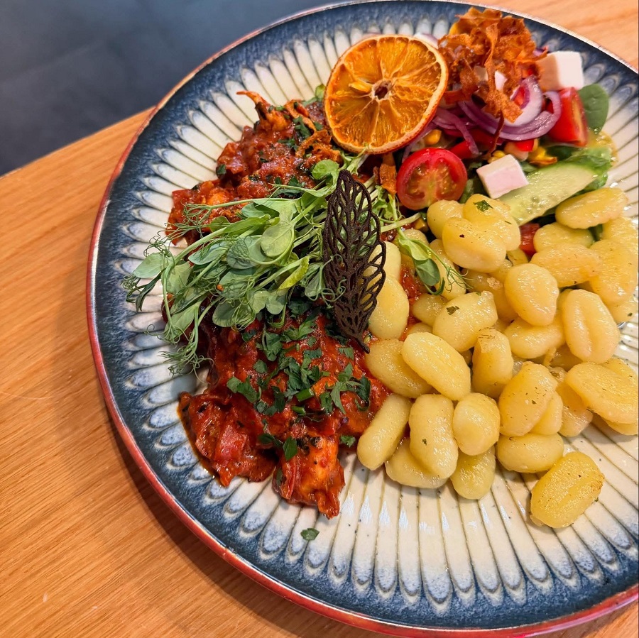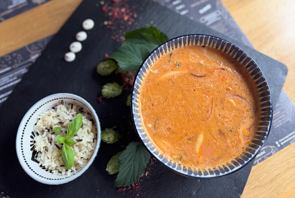 tajska zupa na bazie mleka kokosowego z krewetkami królewskimi, warzywami, z grzybami shimeji, podawana z porcją ryżu